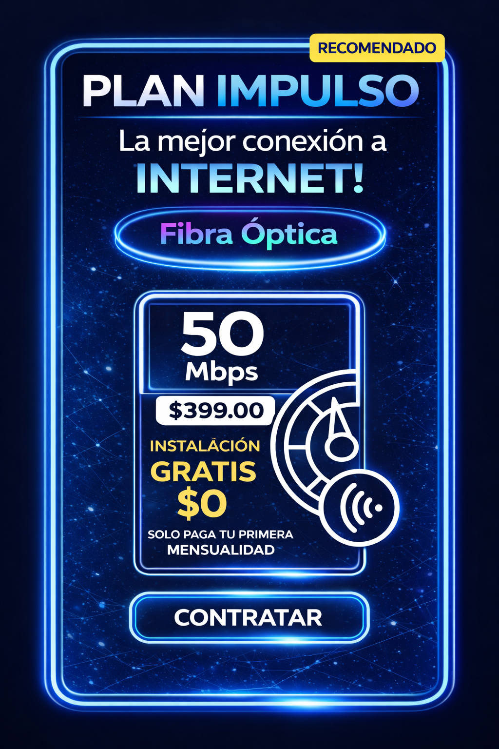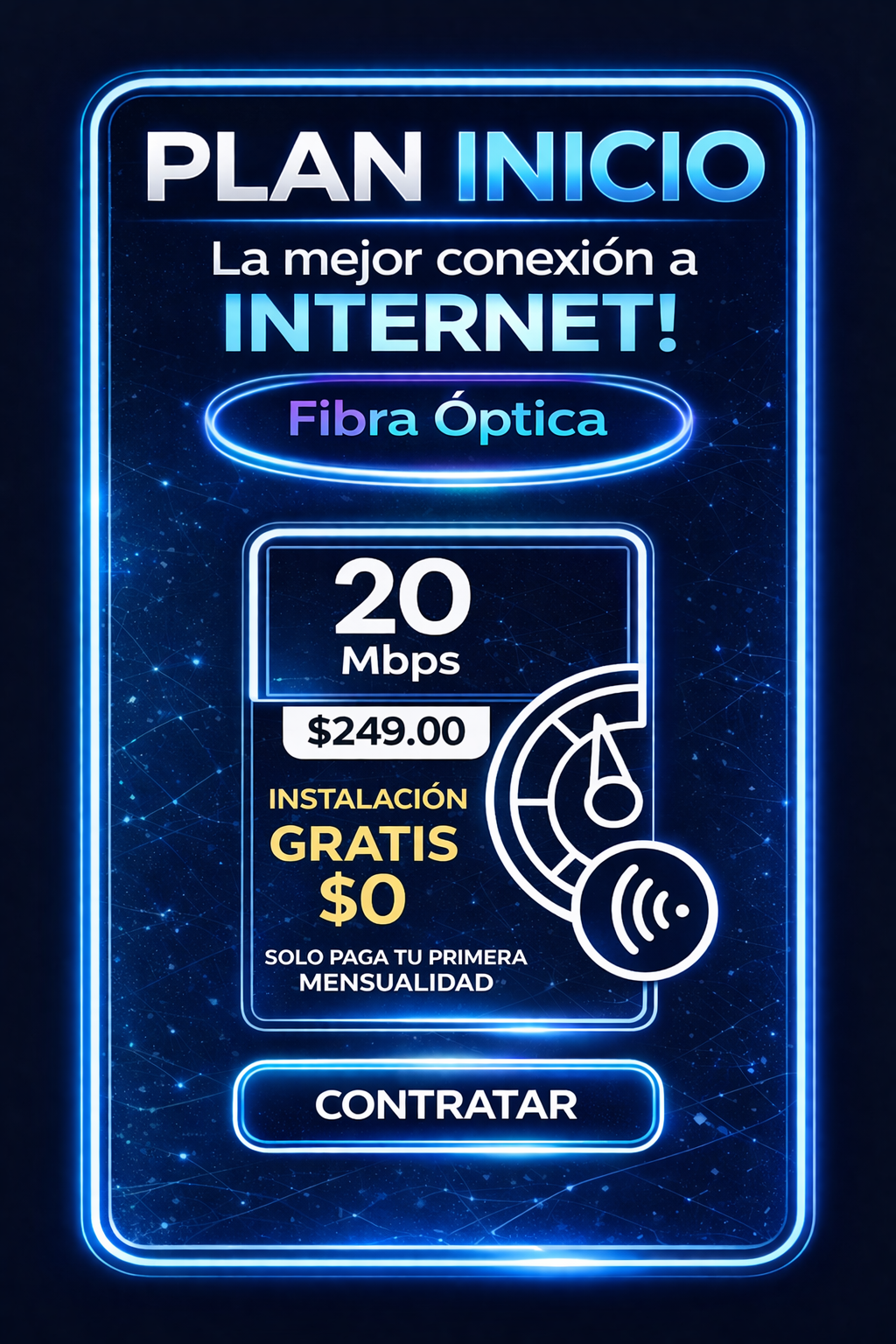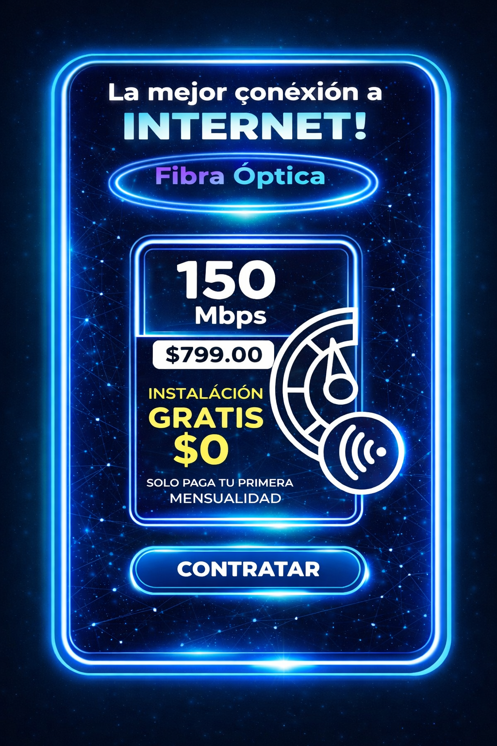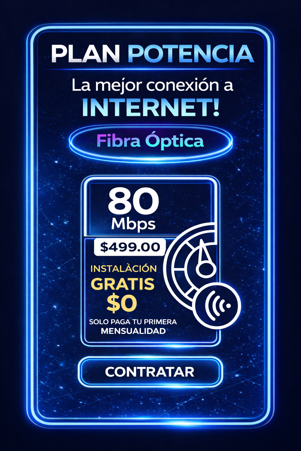 Elige el plan perfecto para ti y disfruta de una conexión rápida, estable y sin interrupciones. Nuestra tecnología de fibra óptica te ofrece el mejor rendimiento para trabajar, estudiar y entretenerte sin límites. Disponibles en el municipio de Cocotitlán.